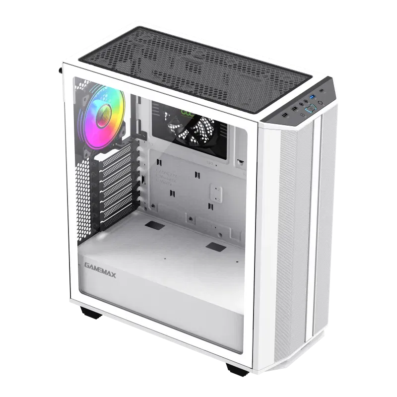 Incluye un ventilador ARGB preinstalado, permitiendo efectos de iluminación personalizables para crear una estética gamer única. Su diseño en blanco proporciona una apariencia moderna y limpia, mientras que su construcción robusta garantiza durabilidad.